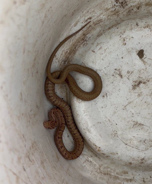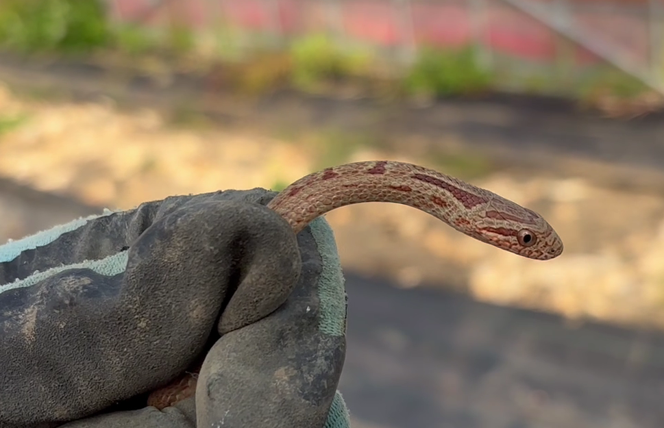 ビニールハウスの片付けをしていたらシマヘビの子どもがいました。